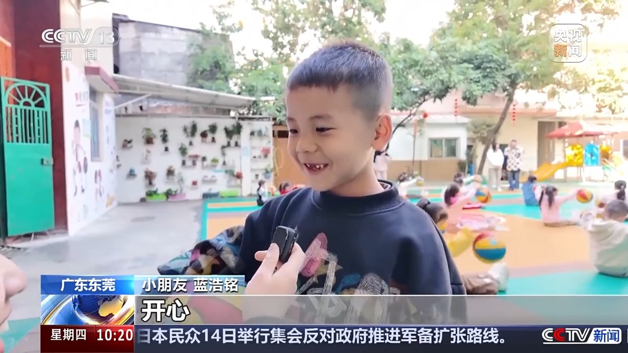 东莞大朗巷尾新苗幼儿园老师何彩婷:当时看到他们掉球了,我心里也挺紧张的,后来没想到他们变换队形的时候,小朋友一脚就把球踢回去给他了,那时候也挺暖心,挺开心的。