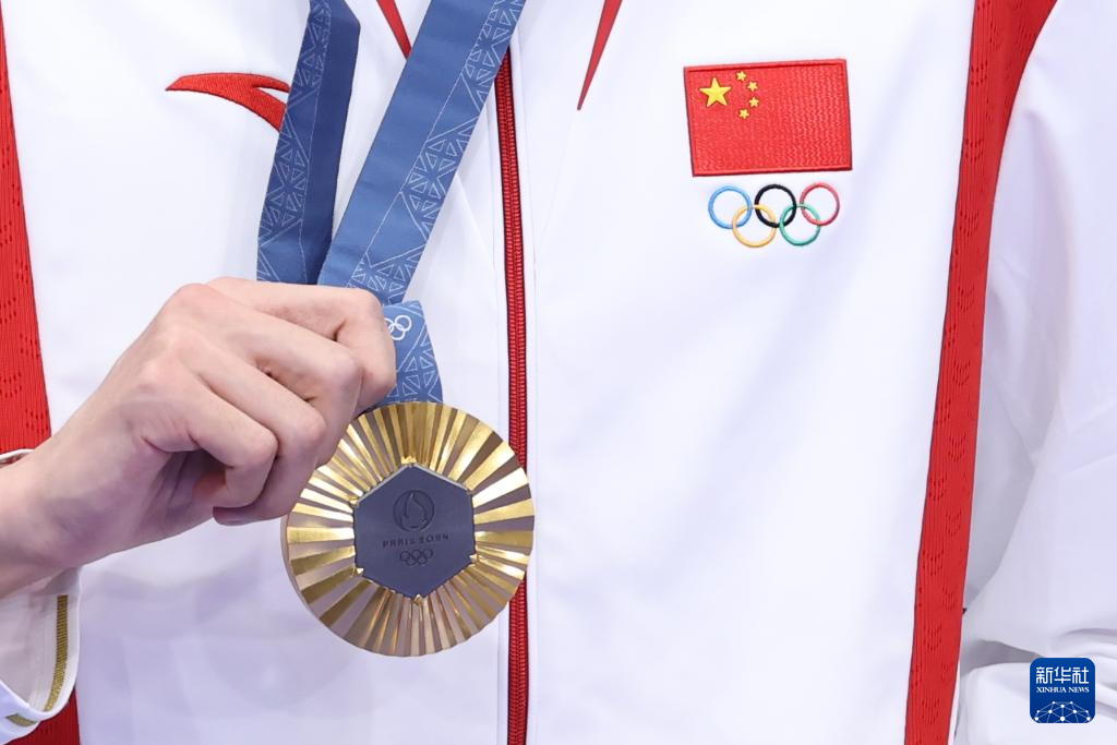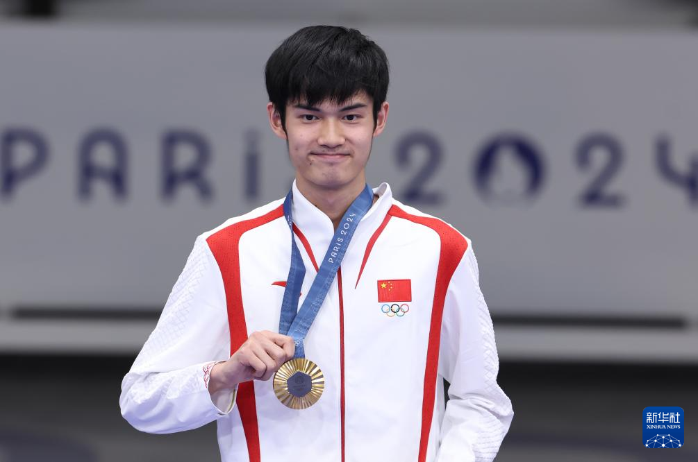 7月29日,中国选手盛李豪展示金牌。新华社记者 张帆 摄