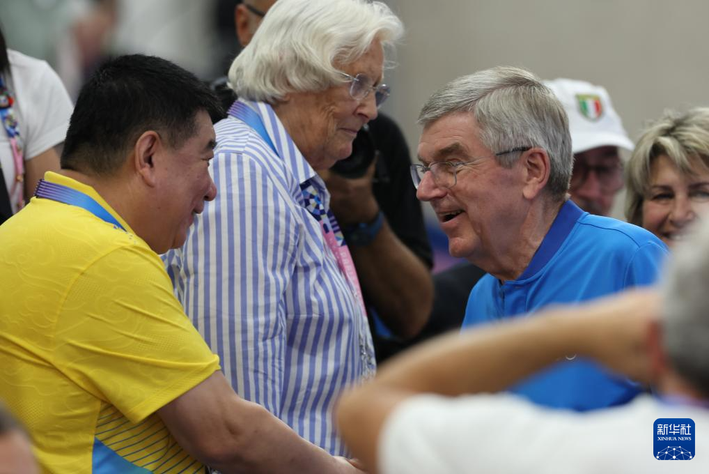 7月29日,国际奥委会主席巴赫(中右)在比赛现场与国际射联副主席、中国射击奥运冠军王义夫(左一)交流。新华社记者 赵丁喆 摄