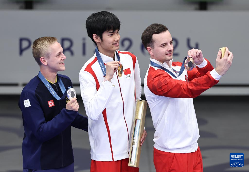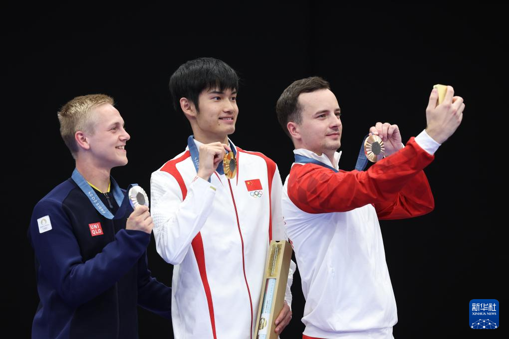 7月29日,冠军中国选手盛李豪(中)、亚军瑞典选手林德格伦(左)和季军克罗地亚选手马里契奇在颁奖仪式上自拍。新华社记者 张帆 摄