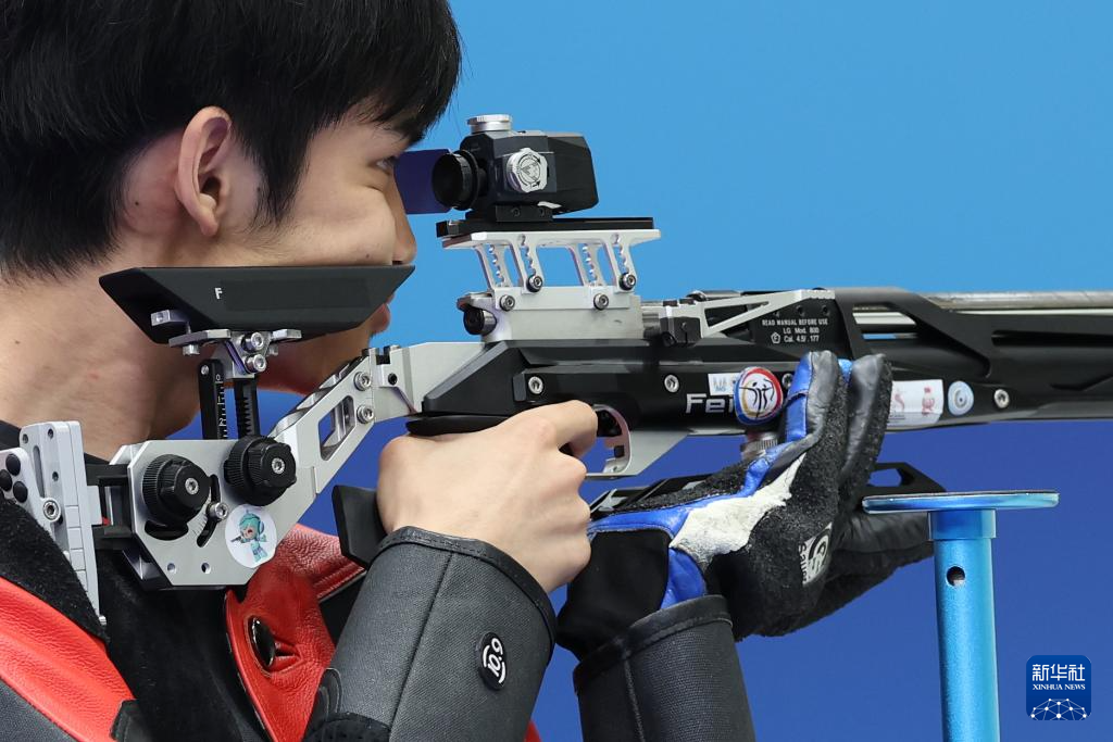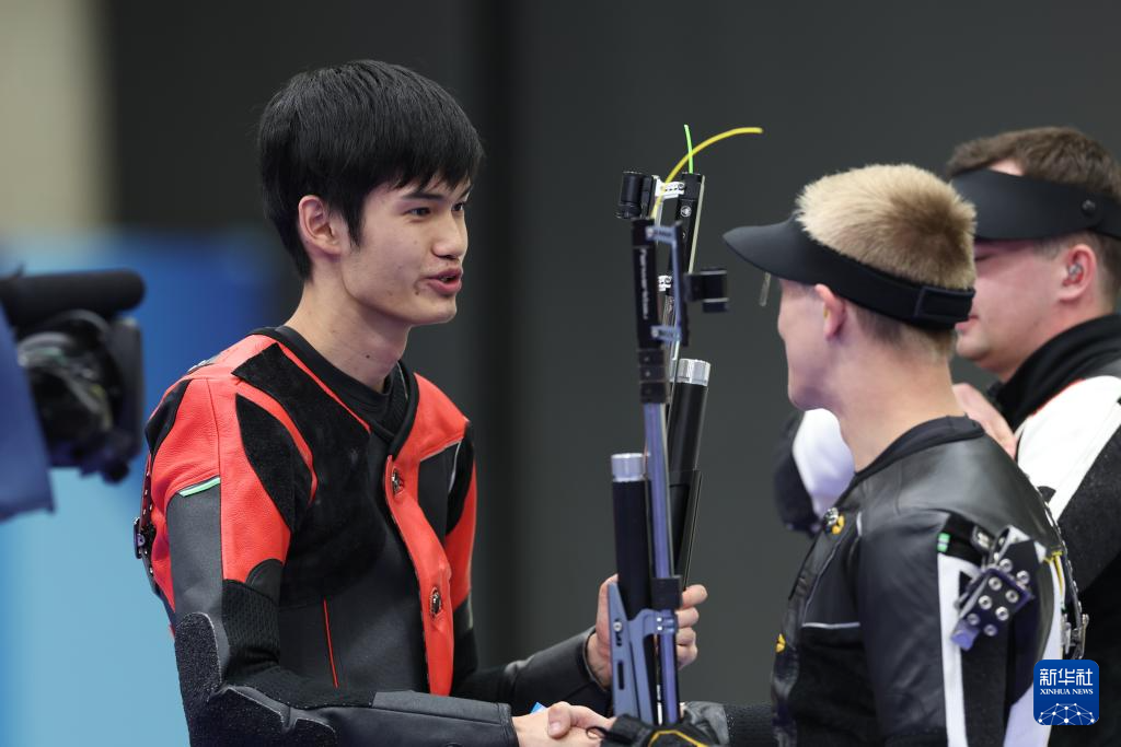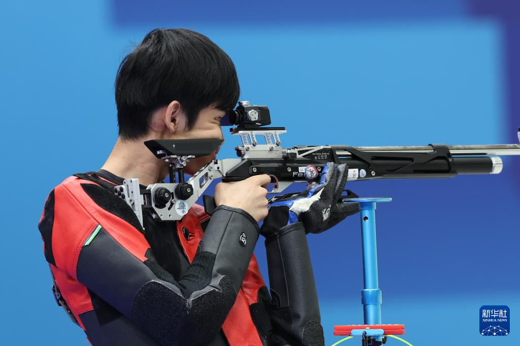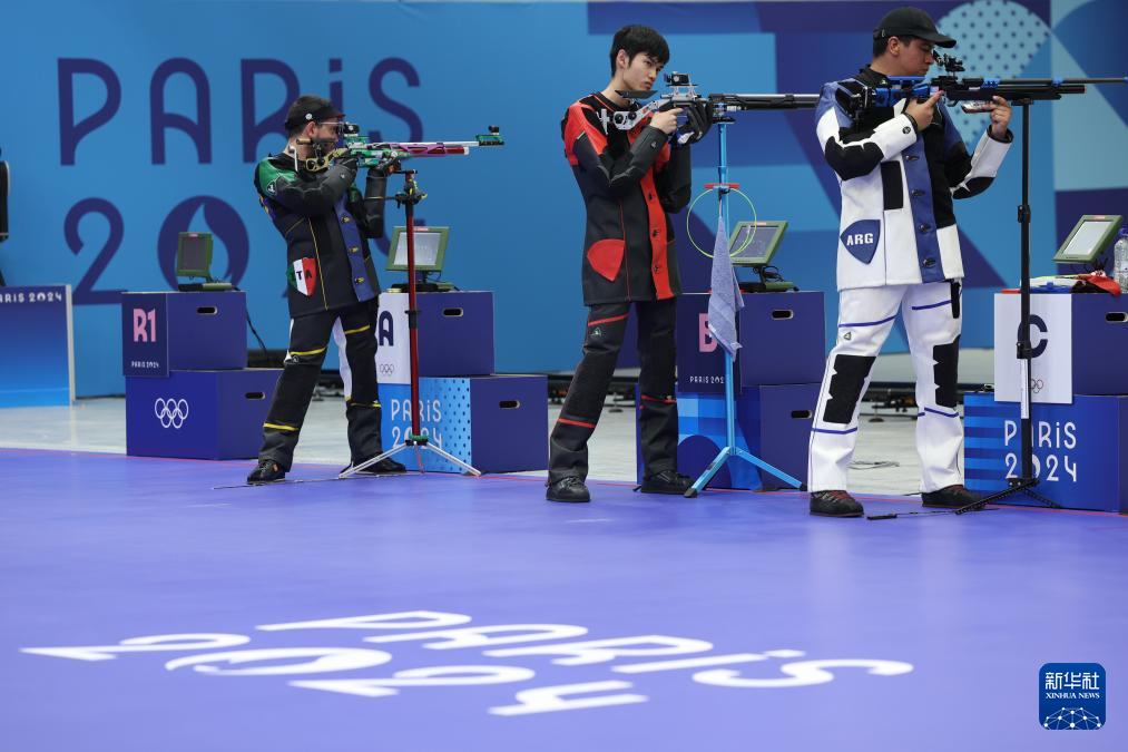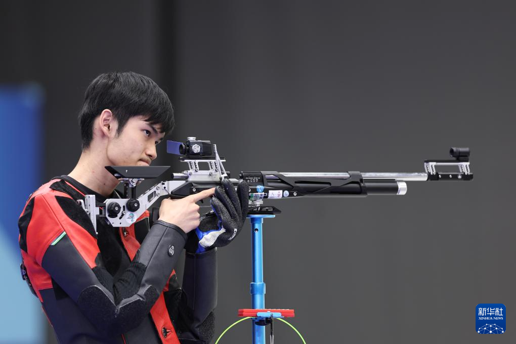 7月29日,盛李豪(中)在比赛中。当日,在法国沙托鲁举行的巴黎奥运会射击男子10米气步枪决赛中,中国选手盛李豪获得冠军。新华社记者 赵丁喆 摄