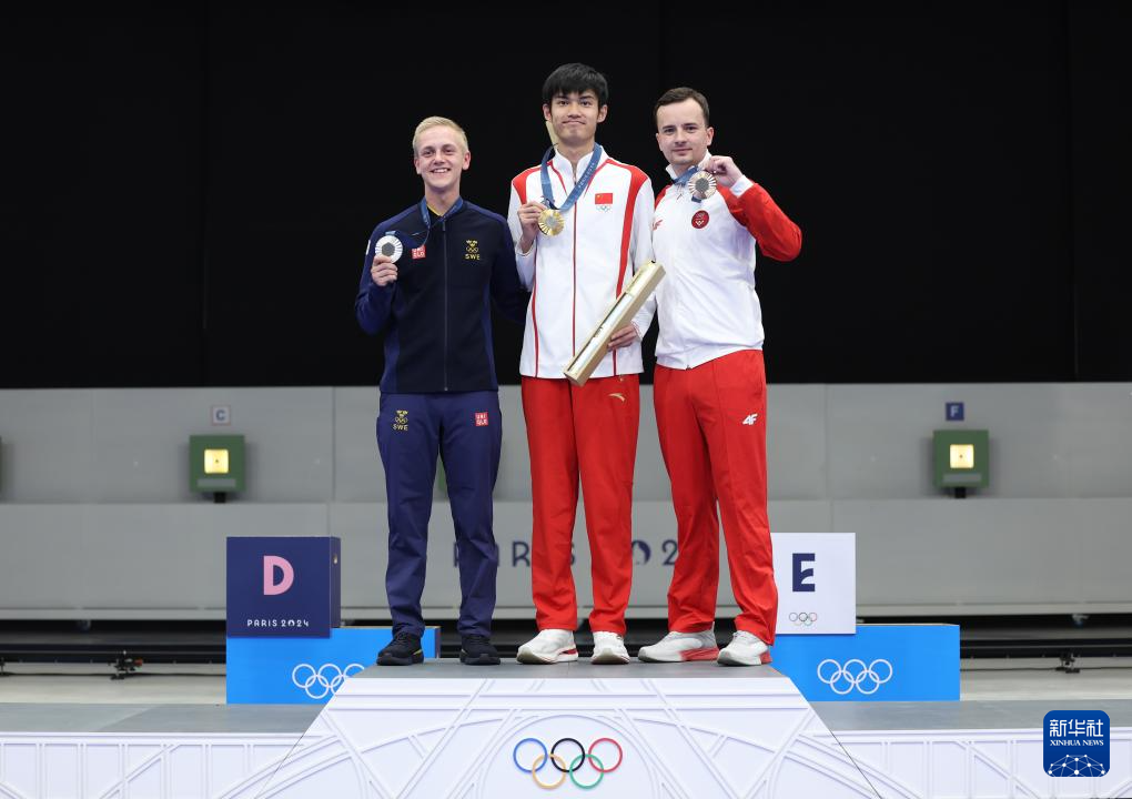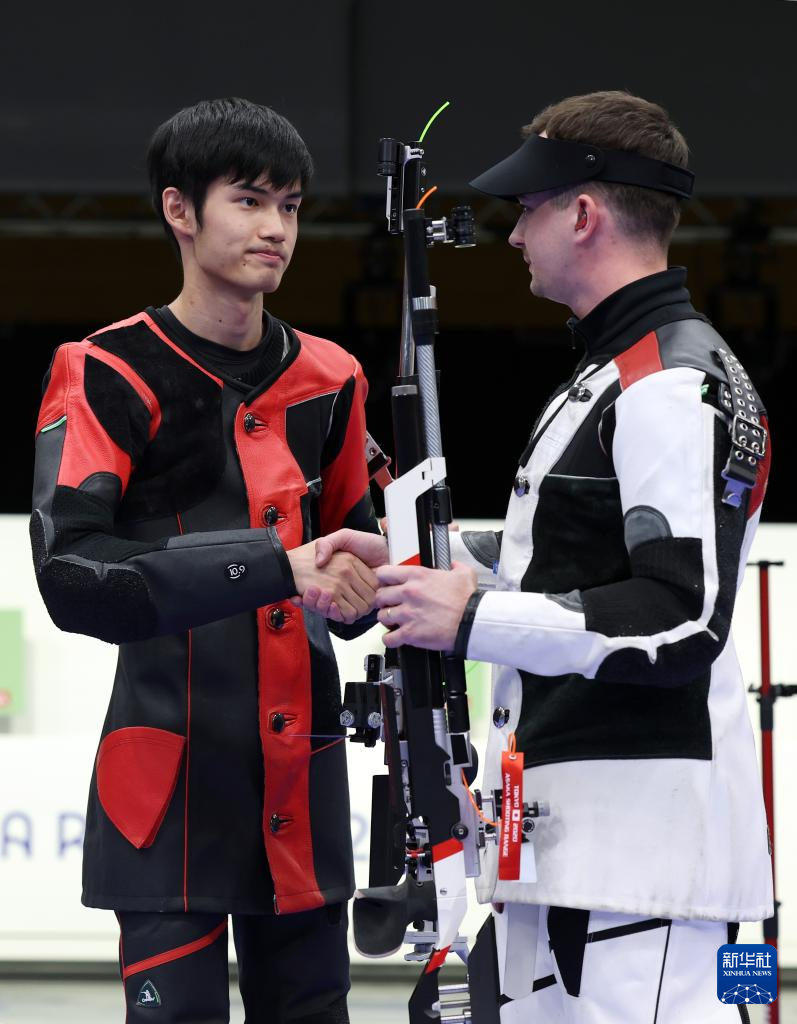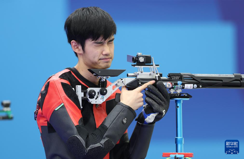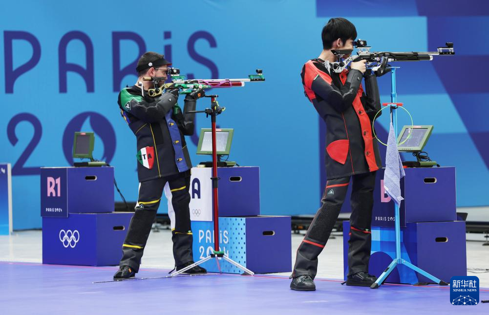 7月29日,盛李豪(中)在比赛中。当日,在法国沙托鲁举行的巴黎奥运会射击男子10米气步枪决赛中,中国选手盛李豪获得冠军。新华社记者 赵丁喆 摄