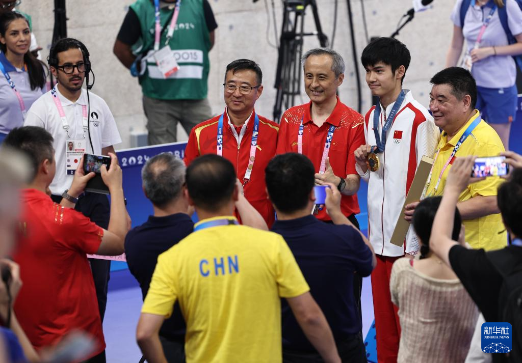 7月29日,冠军中国选手盛李豪(右二)与国际射联副主席、中国射击奥运冠军王义夫(右一)等在颁奖仪式后合影。新华社记者 张帆 摄
