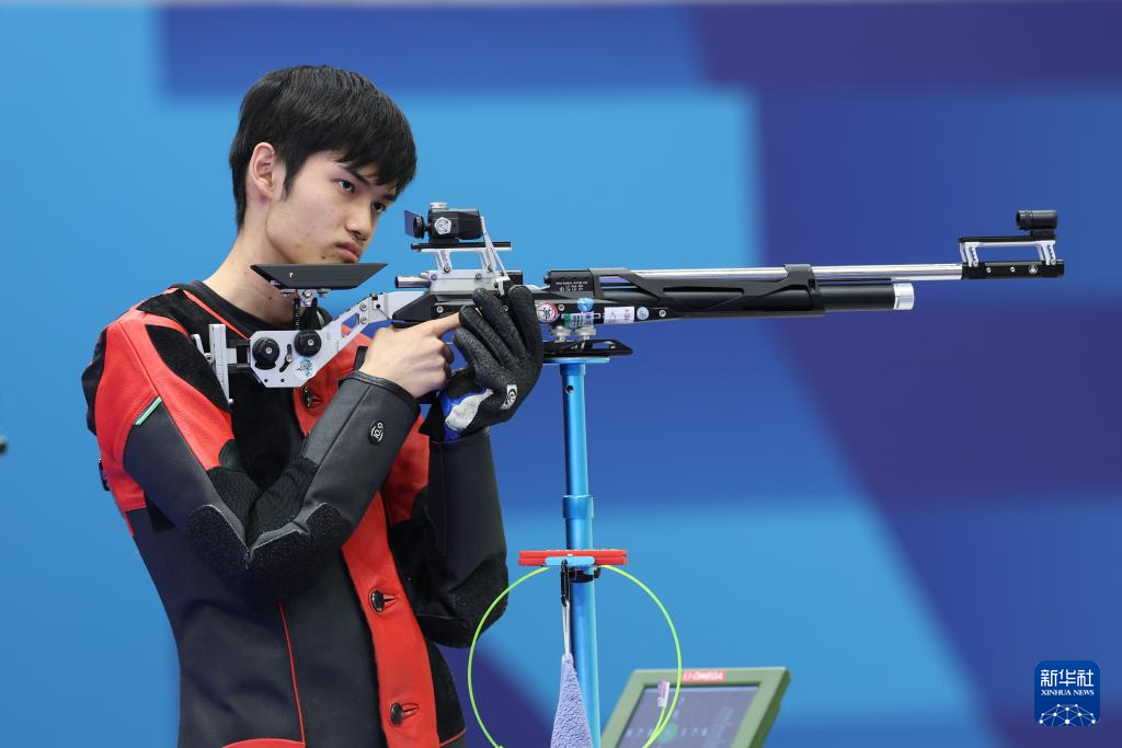7月29日,盛李豪在比赛中。当日,在法国沙托鲁举行的巴黎奥运会射击男子10米气步枪决赛中,中国选手盛李豪获得冠军。新华社记者 赵丁喆 摄