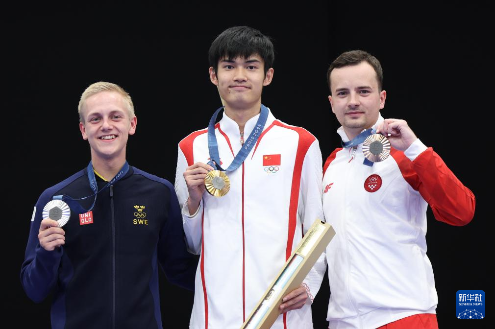 7月29日,冠军中国选手盛李豪(中)、亚军瑞典选手林德格伦(左)和季军克罗地亚选手马里契奇在颁奖仪式上。新华社记者 赵丁喆 摄