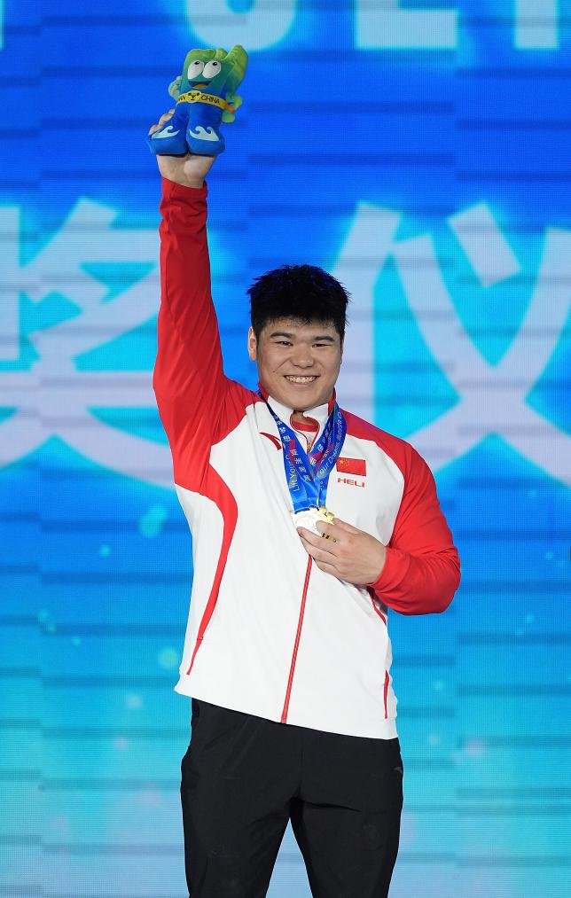 5月14日,中国选手刘焕华在颁奖仪式上。最终,他获得挺举、总成绩两项冠军和抓举亚军。新华社记者 侯昭康 摄