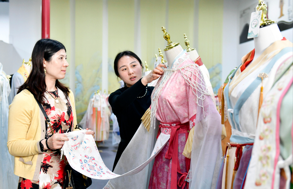 4月10日,在曹县汉服产业基地,工作人员向顾客推荐新款汉服。新华社记者 郭绪雷 摄