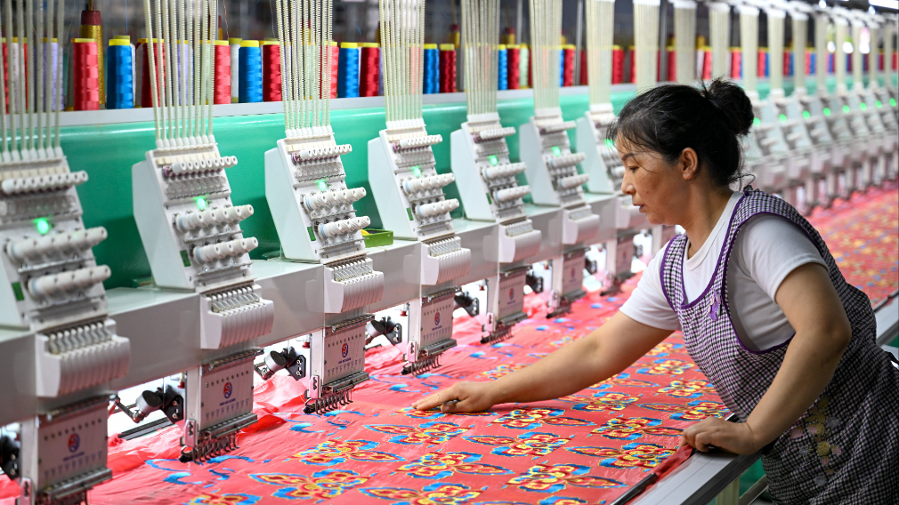 6月19日,在曹县昌顺绣花公司,工作人员查看正在绣制的布料。新华社记者 徐嘉懿 摄