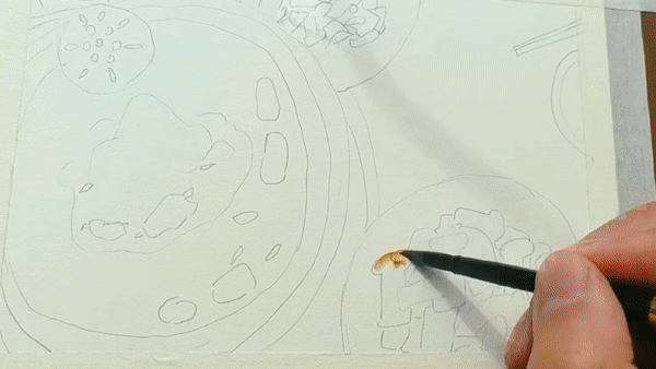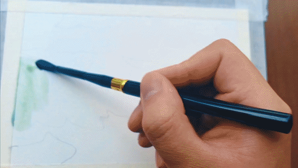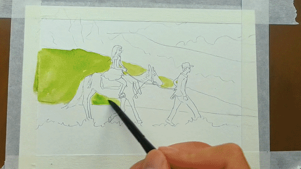 展开画纸,最先捕捉到的是夏日鲁朗层次丰富的绿意:嫩绿的草地铺展开来,湖水映出清澈的蓝绿色泽,远处的山峦泛着淡淡青色,层层叠叠。道路在明媚的阳光下,洁白如雪,在绿色中蜿蜒,串联起一个个藏式村落。