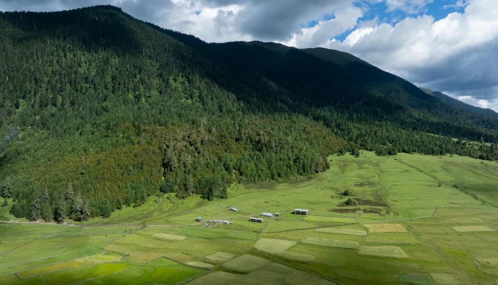 俯瞰扎西岗村旁的花海牧场(无人机照片)。新华社记者 丁增尼达 摄