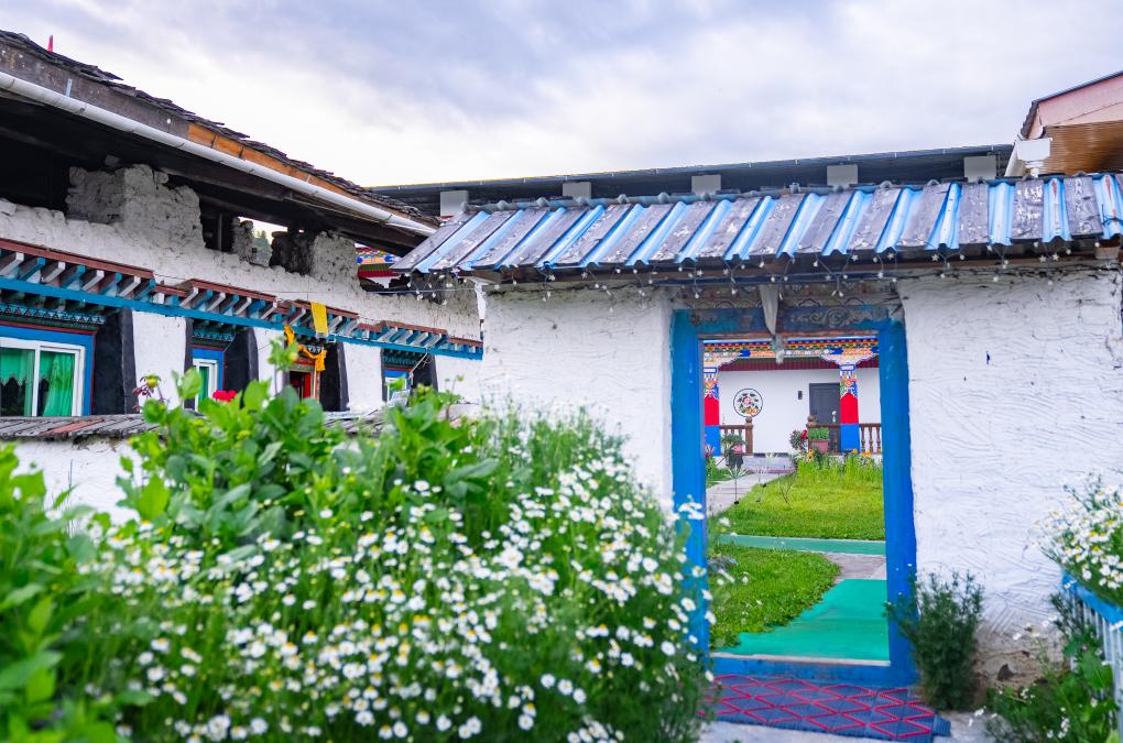 旦增家的藏式民宿门前种满了鲜花。新华社记者 丁增尼达 摄