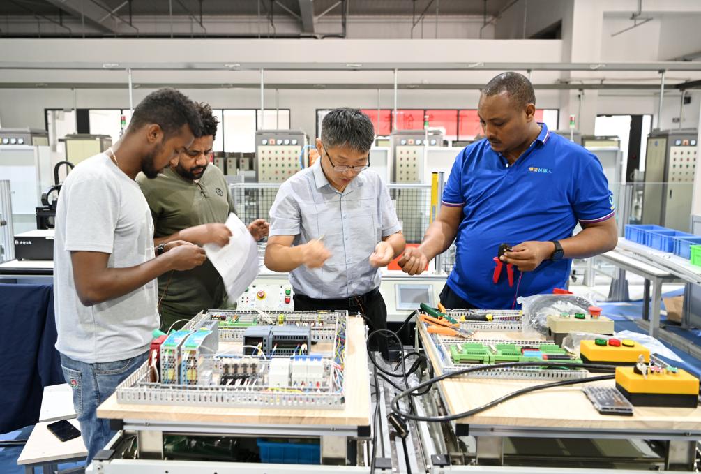 在天津职业技术师范大学,老师带领韩士兰(右一)和其他留学生进行实训操作(2022年7月29日摄)。韩士兰来自埃塞俄比亚,在天津学习期间,韩士兰积极利用学校先进的职业教育实践条件,专注于人工智能制造和工业机器人方向的研究。新华社记者李然 摄