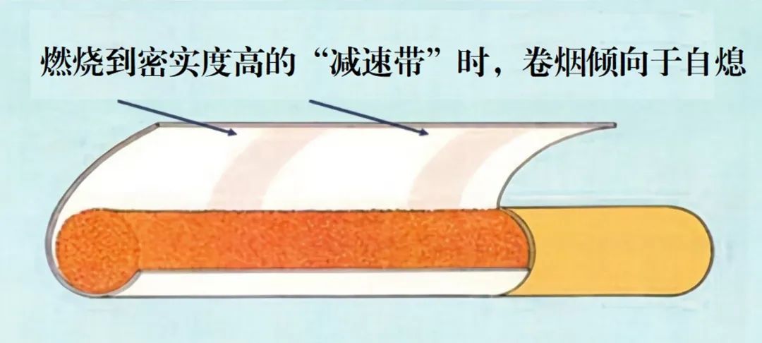 目前,国际上主流的卷烟低延燃技术,是在与卷烟纸相隔20毫米的距离,设置2条6毫米宽的密实带,通过改变卷烟纸的透气性,抑制氧气供应、降低燃烧速度,从而实现自熄——这一技术简单方便,被形象地比喻为卷烟燃烧设置“减速带”,由于没有使用任何化学产品,既不影响吸烟者感觉,也不会明显增加成本。目前,美国产销的所有卷烟在外包装条形码区,都会标注“FSC”(即“符合消防标准”,Fire Standards Compliant的缩写)。