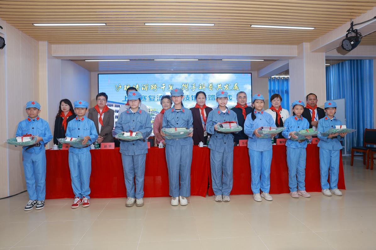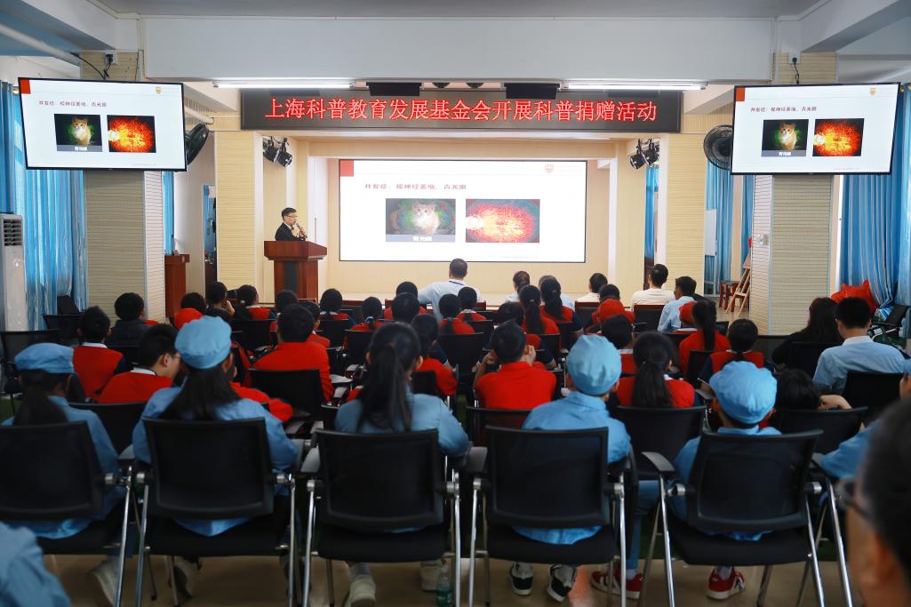 活动当日下午,捐赠仪式在学校礼堂正式举行。学生代表为与会嘉宾佩戴红领巾,上海市眼病防治中心专家团队将医院原创的《眼睛逃跑计划》《开学护眼第一课》等科普书籍逐一送到孩子们的手中,传递着来自上海医疗专家的健康关爱与期盼。
