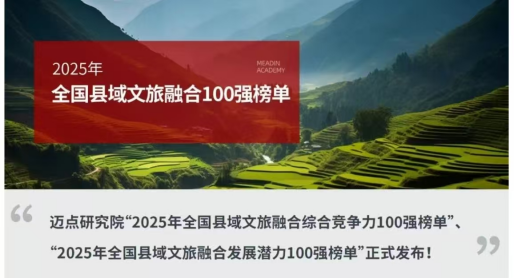 以下是迈点研究院最新发布的“2025年全国县域文旅融合综合竞争力100强榜单”以及“2025年全国县域文旅融合发展潜力100强榜单”。其中“2025年全国县域文旅融合综合竞争力100强榜单”排名前十的县域依次是:大理市、景洪市、平遥县、临海市、荔波县、安吉县、栾川县、婺源县、黟县、溧阳市;而“2025年全国县域文旅融合发展潜力100强榜单”排名前十的县域依次是:丰都县、东阳市、涉县、集安市、石柱县、石城县、敦化市、布尔津县、修水县、南安市。