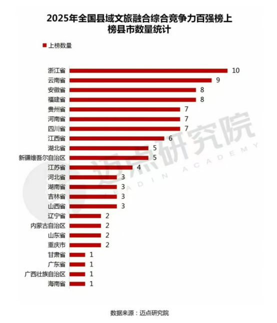 2025年全国县域文旅融合综合竞争力百强县分布在23个省市自治区。其中,浙江占10席,云南占9席,安徽、福建各占8席,贵州、河南、四川各占7席,江西占6席,湖北、新疆维吾尔自治区各占5席。