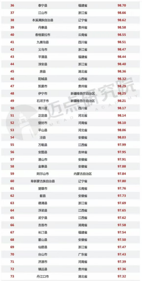 浙江省有15个县域入围,分别是东阳市、象山县、乐清市、桐乡市、磐安县、海宁市、长兴县、嘉善县、开化县、诸暨市、慈溪市、天台县、缙云县、永嘉县、浦江县;其次是江西省,有8个县域入围,分别是石城县、修水县、瑞金市、靖安县、南昌县、永修县、弋阳县、遂川县。广西壮族自治区、湖北省、湖南省各有7个县域入围,分别是广西壮族自治区(7个):容县、龙胜县、昭平县、兴安县、合浦县、融水县、金秀县;湖北省(7个):钟祥市、巴东县、英山县、神农架林区、赤壁市、京山市、大冶市;湖南省(7个):永顺县、衡阳县、长沙县、醴陵市、平江县、资兴市、宜章县;贵州省、重庆市各有6个入围,分别是贵州省(6个):桐梓县、习水县、盘州市、大方县、仁怀市、清镇市;重庆市(6个):丰都县、石柱县、巫山县、云阳县、彭水县、垫江县;广东省(5个):惠东县、南澳县、廉江市、博罗县、英德市。