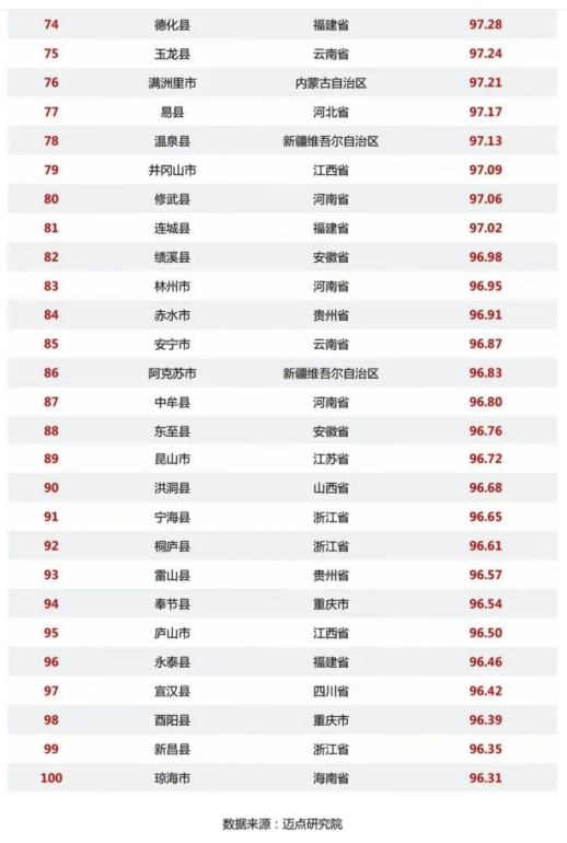 其中浙江省表现最为突出,临海市、安吉县、江山市、义乌市、淳安县、德清县、仙居县、宁海县、桐庐县、新昌县等10个县域入围;其次是云南省,有大理市、景洪市、建水县、腾冲市、芒市、香格里拉市、楚雄市、玉龙县、安宁市等9个县域入围。安徽省、福建省各有8个县域入围,分别是安徽省(8个):黟县 、泾县、潜山市、金寨县、歙县、霍山县、绩溪县、东至县;福建省(8个):晋江市、武夷山市、泰宁县、平潭县、长汀县、德化县、连城县、永泰县。其他表现较佳的省份有贵州省(7个):荔波县、兴义市、丹寨县、凯里市、镇远县、赤水市、雷山县;河南省(7个):栾川县、新县、登封市、济源市、修武县、林州市、中牟县;四川省(7个):都江堰市 、峨眉山市、汶川县、西昌市、九寨沟县、青川县、宣汉县;江西省(6个):婺源县 、万载县、浮梁县、武宁县、井冈山市、庐山市。湖北省(5个):恩施市、宣恩县、利川市、房县 、丹江口市;新疆维吾尔自治区(5个):喀什市、伊宁市、石河子市、温泉县、阿克苏市。
