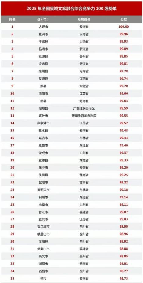 2025年全国县域文旅融合综合竞争力100强榜单
