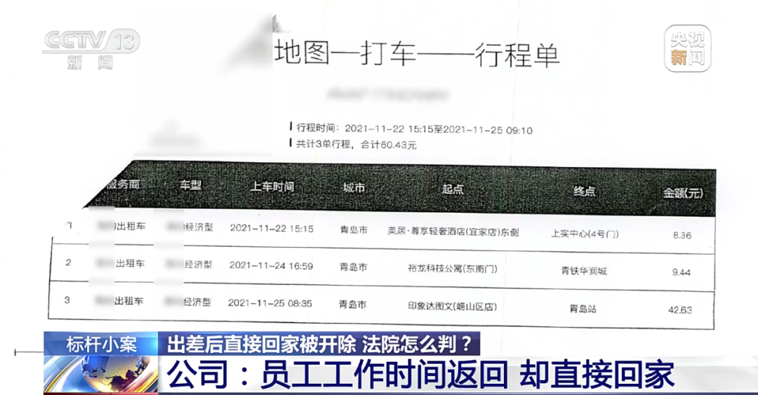 而在2023年4月,公司人员审查徐先生的以往出差行程时,认为他有违反公司规定的行为。在这份报销单据上可以看到,徐先生于2021年11月22日早上八点半左右,乘坐高铁从南京出发前往青岛出差,并于同年11月25日早上9点半左右,乘坐高铁返回。