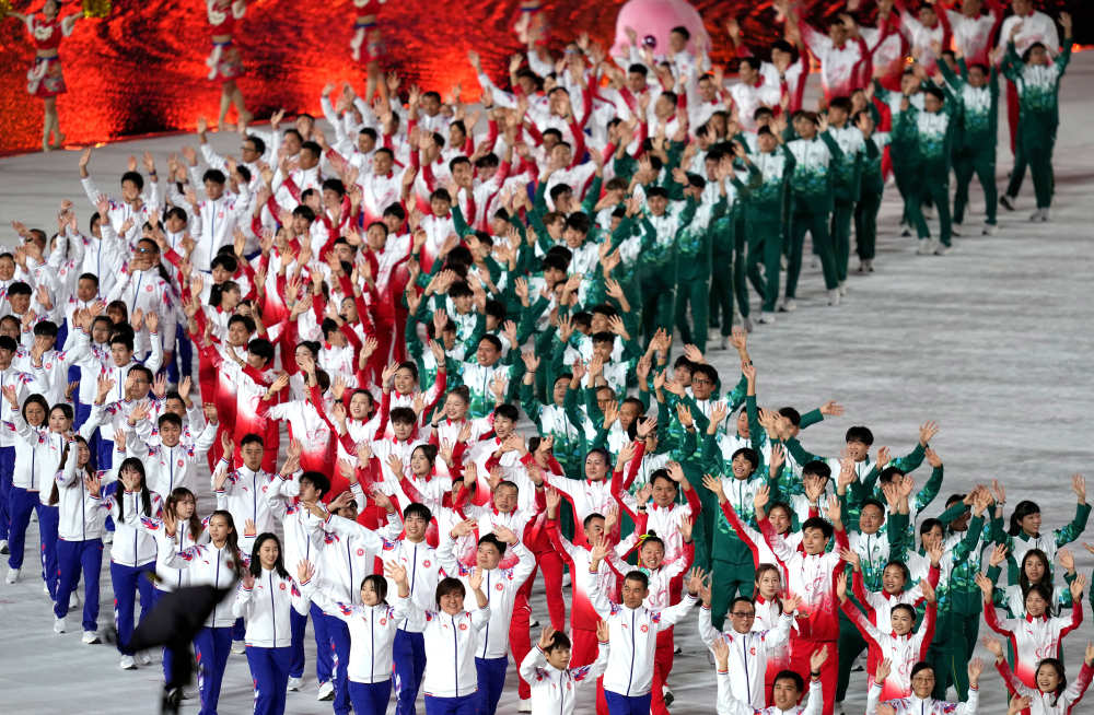 广东省体育代表团、香港特别行政区体育代表团、澳门特别行政区体育代表团在入场仪式上共同入场。新华社记者赖向东摄