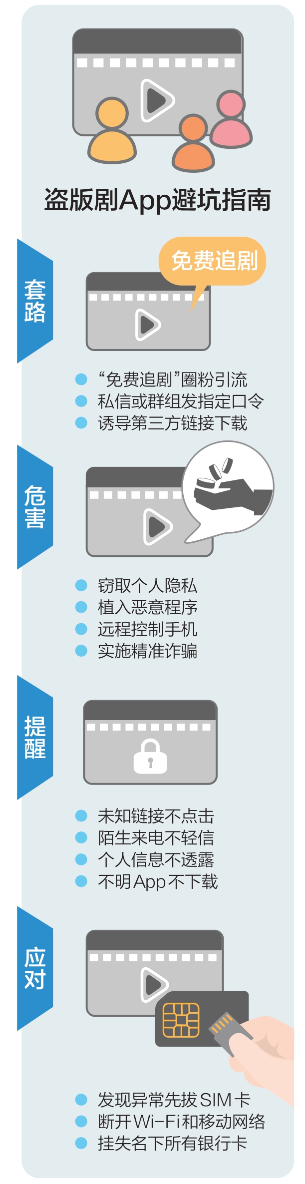 “恪守‘四不原则’是防范电信网络诈骗的核心,要做到未知链接不点击、陌生来电不轻信、个人信息不透露、不明App不下载。”王佳强调,正规的影视资源需要通过官方平台观看,不要为了节省会员费而下载非应用商店的App,“这些App没有经过正规审核,风险极高,可能包含恶意程序和病毒。”