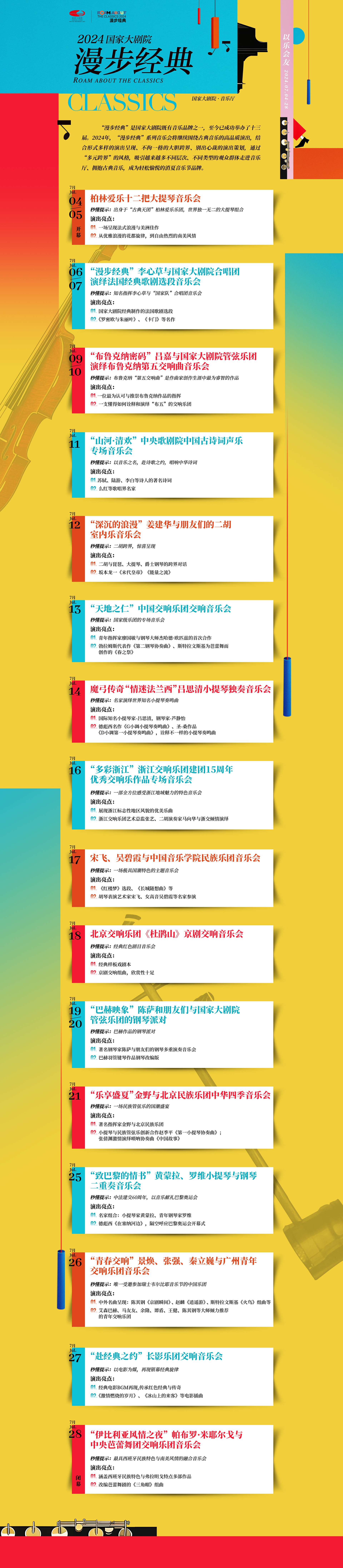 7月4日-28日,今年国家大剧院漫步经典系列音乐会如约而至。本届漫步经典规模空前,将在25天的时间里,为观众呈现16台20场精心策划的音乐会。平易近人的古典音乐、活力摇摆的爵士乐、精彩绝伦的民乐、精致典雅的中国风,带观众用最轻松的方式感受音乐的无限可能,消夏音乐大礼包送给所有爱乐者。