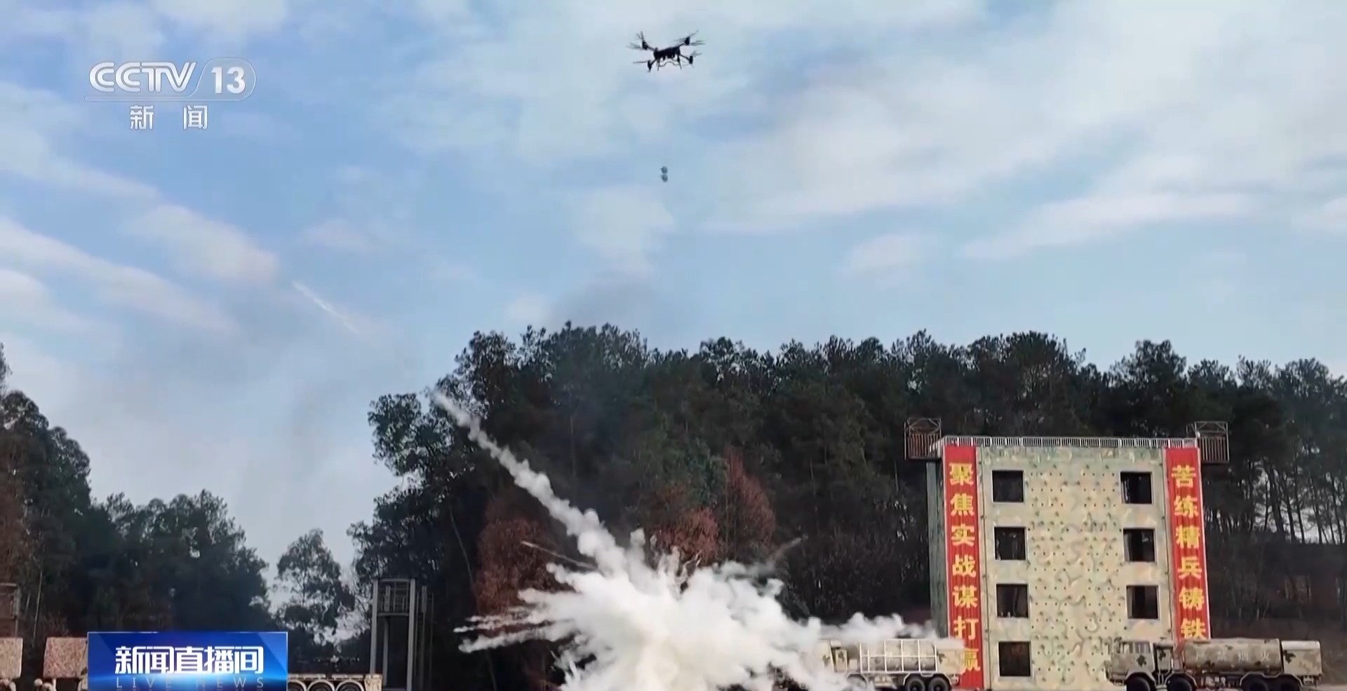 在“敌”无人机袭扰下,部分物资起火,官兵们快速利用无人机空中投放灭火弹,地面机器狗也迅速前出,成功处置火情。而后,运输无人机、无人车成功将物资运送到指定区域,圆满完成此次演练。