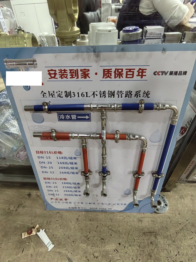 北五环外、立汤路旁的北七家建材批发市场内,有一座“国际五金城”。该市场主要售卖地板、五金水暖管、太阳能、散热器等产品。在市场一层一家水暖管件店门口,摆放着一张高约80厘米、宽约50厘米的宣传板,上面写上了产品品牌、服务热线、“质保百年”等信息,宣传板右上方,标明该产品是“CCTV展播品牌”。