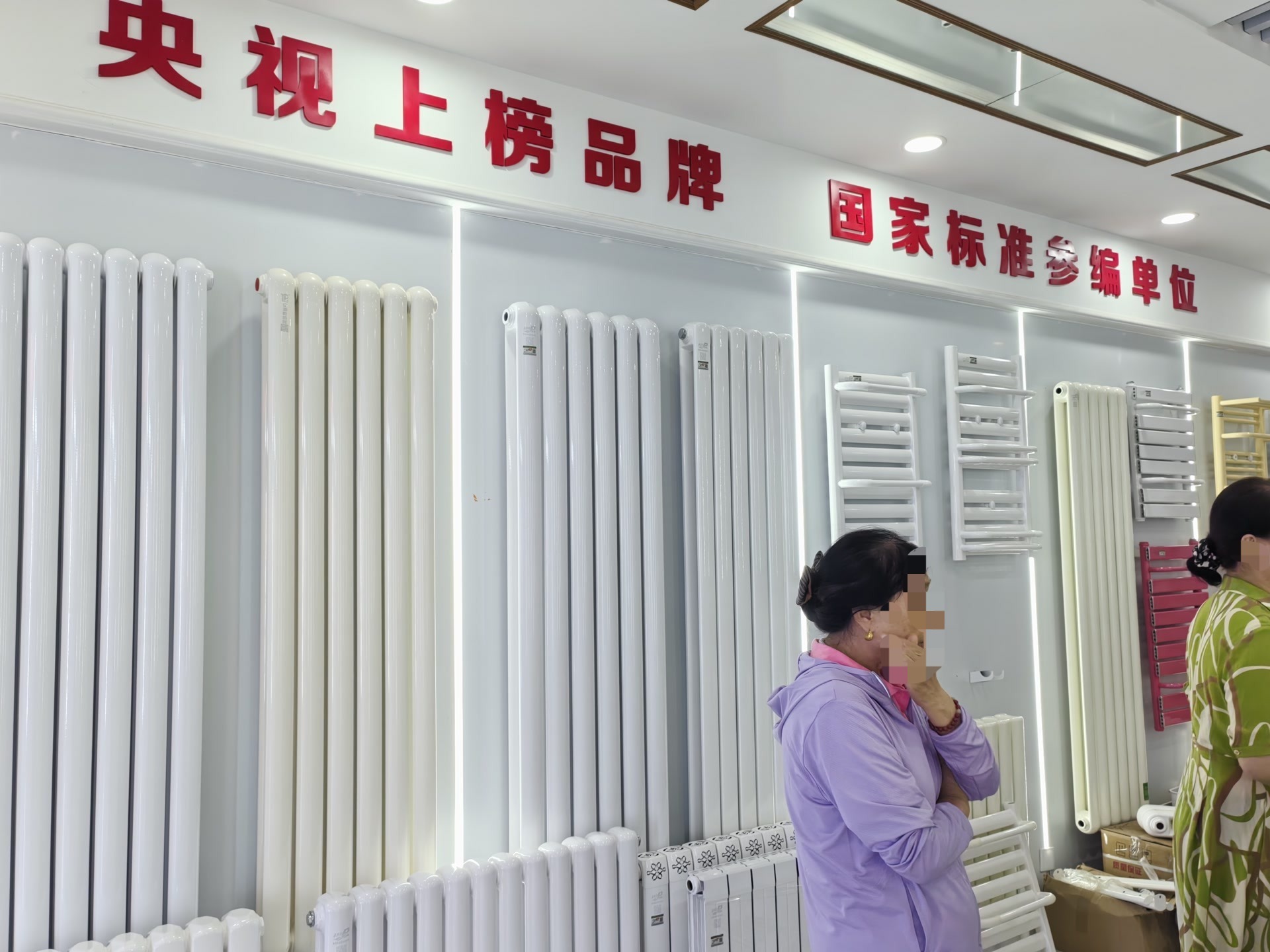 商场二层,某品牌散热器门店内,两名顾客正在咨询购买暖气片。店面进门墙壁上,用红色大字宣传暖气片是“央视上榜品牌”“国家标准参编单位”。在天花板上安装的数盏射灯照射下,宣传语很是显眼。