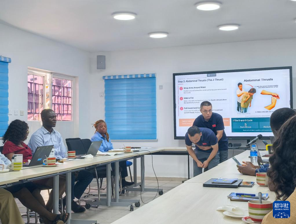 2月9日,在塞拉利昂首都弗里敦,中国第26批援塞拉利昂医疗队成员为联合国儿童基金会驻塞拉利昂办事处员工示范海姆立克急救法。新华社发(中国第26批援塞拉利昂医疗队供图)
