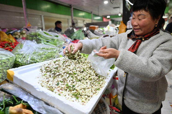 河南省商丘市新华农贸市场,市民在购买槐花。
