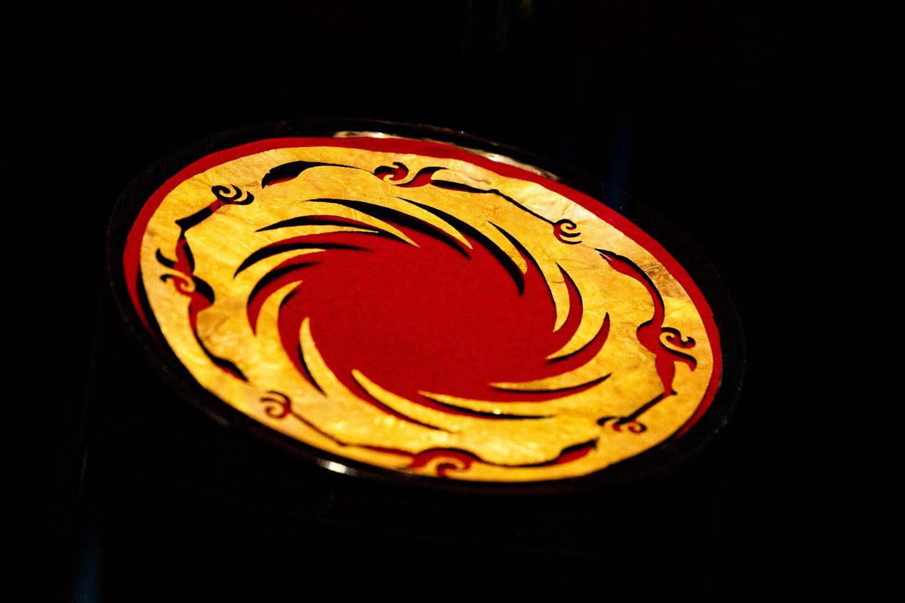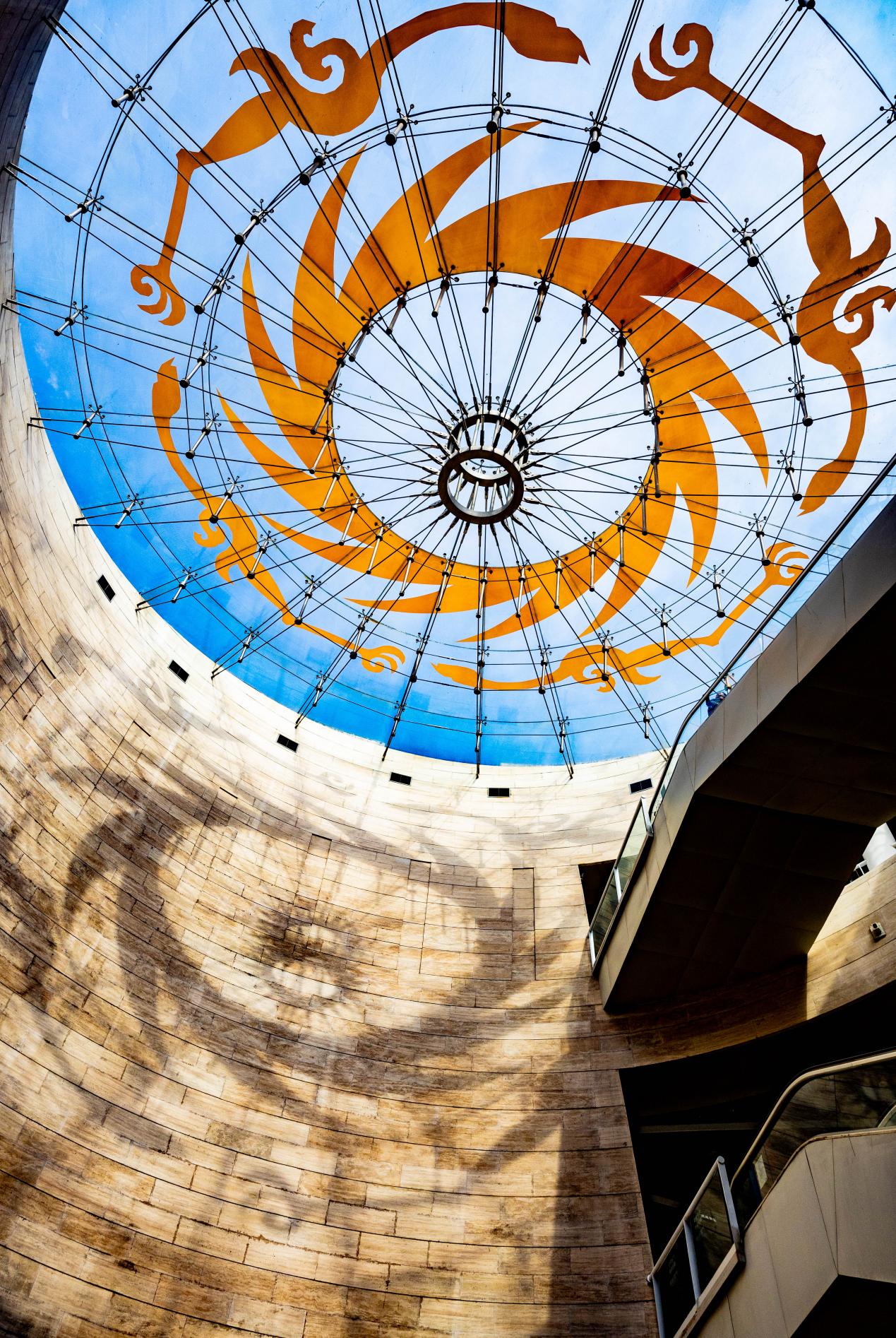 午后阳光透过陈列馆穹顶玻璃在墙面上投射出太阳神鸟图案。新华网发(张可凡 摄)