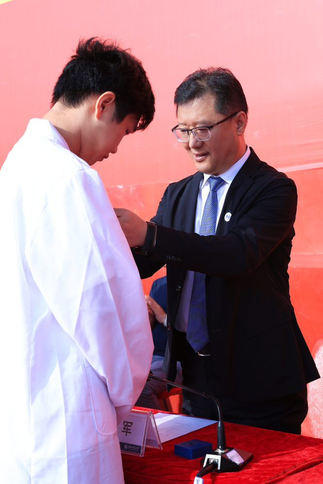 山西医科大学校党委书记王军等学校领导和嘉宾为2025级新生代表佩戴校徽。新华网发