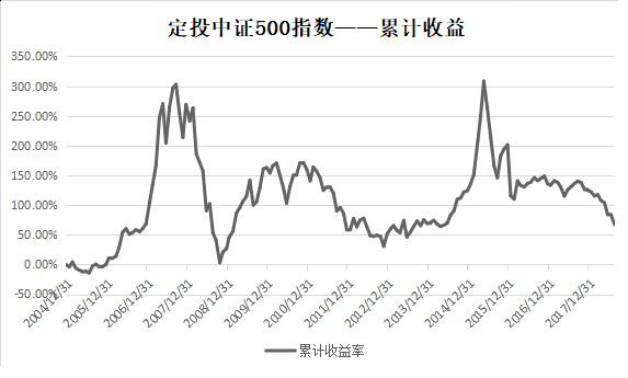 上图是定投中证500指数的累计收益率走势(2014.12-2018.8,每月定投一次),可以看出,每次市场牛转熊时,定投中证500指数的累计收益率,都出现了大幅回撤,也就是说,前期赚的钱都吐出去了。