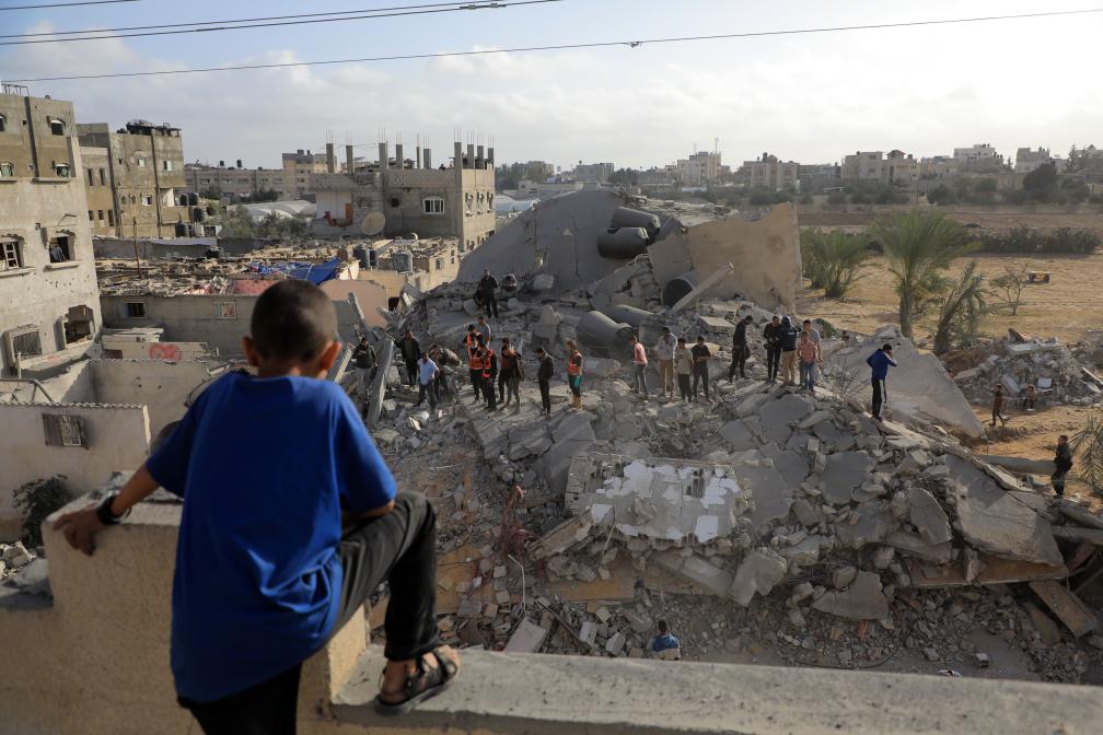 4月21日,在加沙地带南部城市拉法,人们聚集在以色列袭击过后的废墟上。新华社发(里泽克·阿卜杜勒贾瓦德摄)