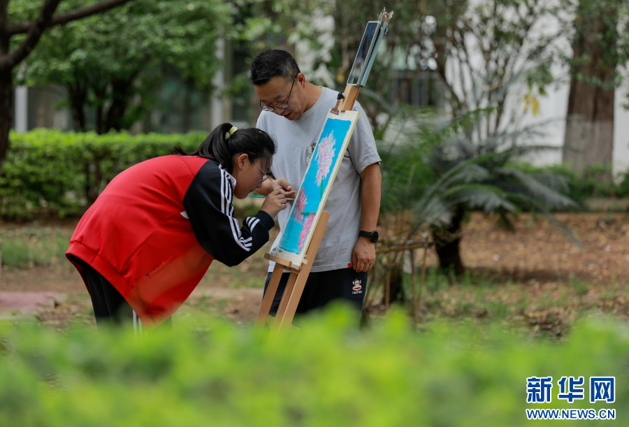 胡晓红的丈夫在指导女儿画画(4月20日摄)。新华网 赵普凡 摄