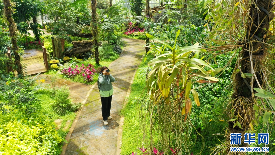 胡晓红在云南省高原特色乡土树种国家林木种质资源库拍摄植物图片(4月19日摄)。新华网 赵普凡 摄