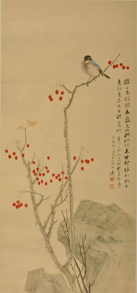 《小鸟樱桃》/张大千/纸本水墨/92x41cm /