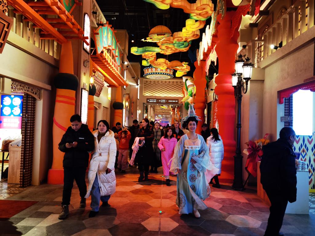 2025年1月1日,乌鲁木齐市“丝路有戏”园区内,游客正在游览体验。新华社记者刘兵 摄