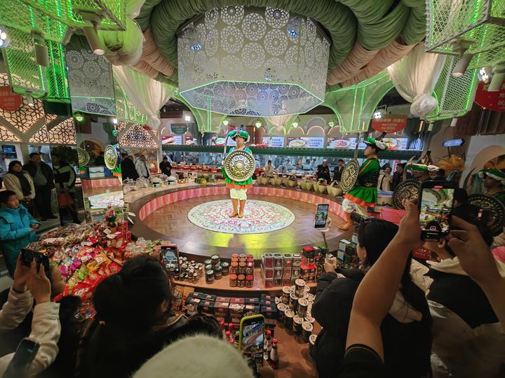 2024年12月15日,乌鲁木齐盛合摩界969文旅公园里的一家餐厅里,顾客们正在观看文艺表演。新华社记者张啸诚 摄