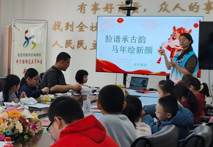 古丽扎旦·苏力堂在五亭社区活动室开展手绘脸谱活动。白碱滩区五亭社区供图