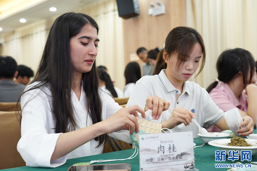 在制作中药香囊环节,中外学生分组协作,在专业老师的指导下,配制艾绒、芸香、薰衣草等具有芳香辟秽,提神醒脑功效的中药材,并将其装入香囊袋中。