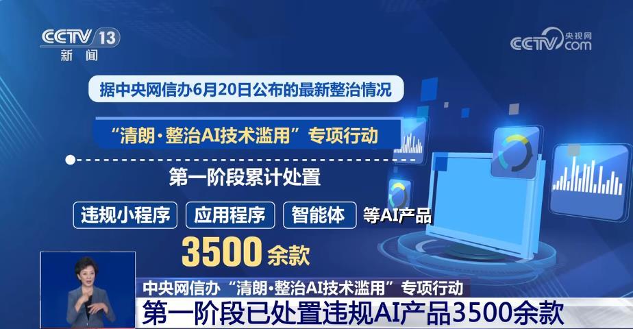 据中央网信办6月20日公布的最新整治情况,专项行动第一阶段已经累计处置违规小程序、应用程序、智能体等AI产品3500余款,清理违法违规信息96万余条,处置账号3700余个,各项工作取得积极进展。