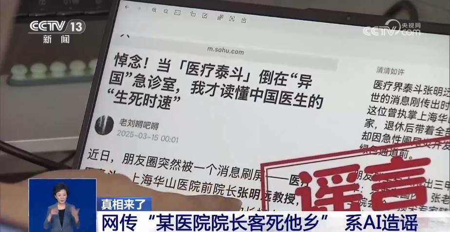 通过滥用AI技术,一条包含“知名三甲医院”“前院长”“客死他乡”等吸引眼球的谣言信息被王某某等人拼凑出来并发布,仅24小时之内,相关谣言的不同版本就在网上被大量传播,造成了恶劣的社会影响。