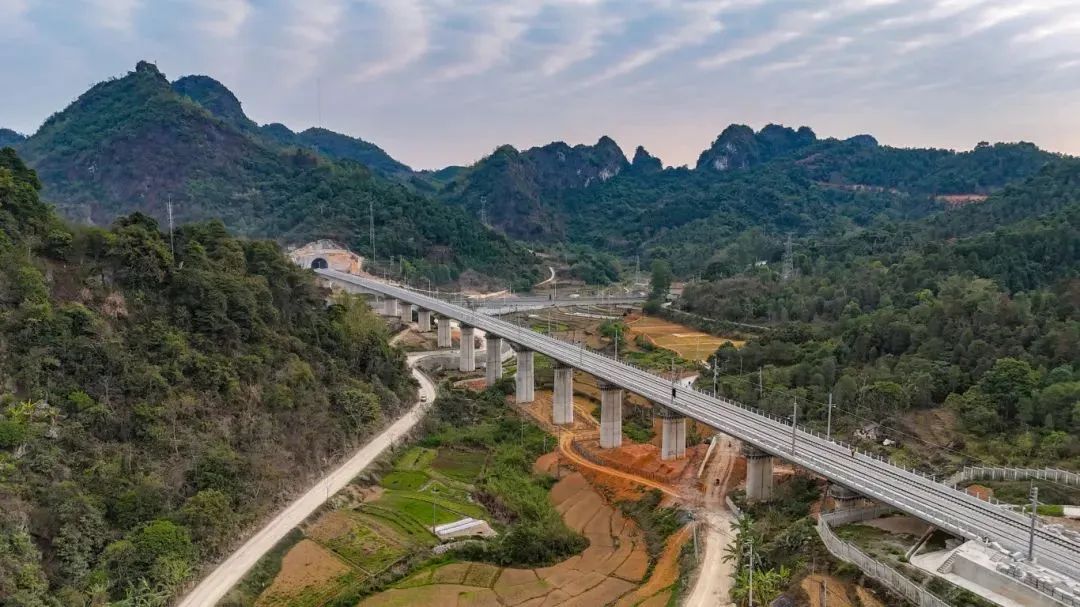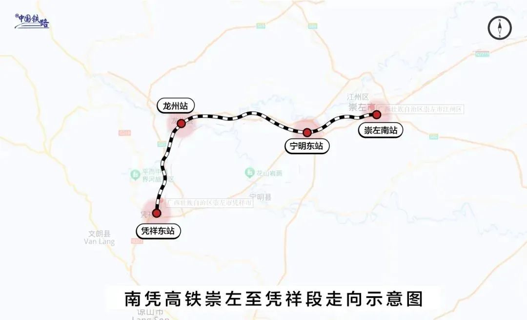 南凭高铁东起广西首府南宁市,向西南经崇左市延伸至凭祥市,正线全长200.8公里,设计时速250公里,分南宁至崇左、崇左至凭祥两段建设,其中南宁至崇左段已于2022年12月5日开通运营。