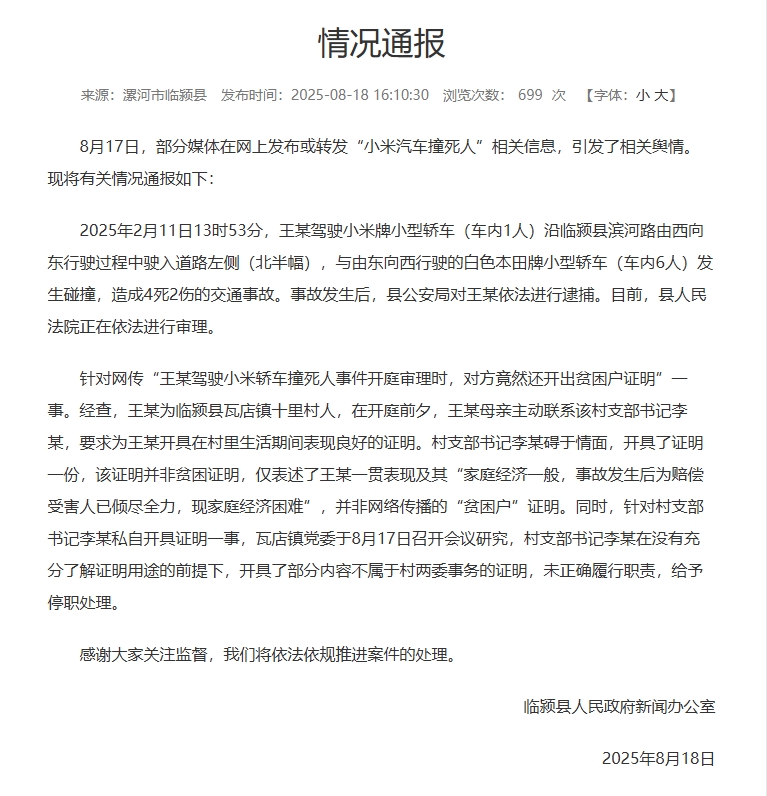 针对网传“王某驾驶小米轿车撞死人事件开庭审理时,对方竟然还开出贫困户证明”一事。经查,王某为临颍县瓦店镇十里村人,在开庭前夕,王某母亲主动联系该村支部书记李某,要求为王某开具在村里生活期间表现良好的证明。村支部书记李某碍于情面,开具了证明一份,该证明并非贫困证明,仅表述了王某一贯表现及其“家庭经济一般,事故发生后为赔偿受害人已倾尽全力,现家庭经济困难”,并非网络传播的“贫困户”证明。同时,针对村支部书记李某私自开具证明一事,瓦店镇党委于8月17日召开会议研究,村支部书记李某在没有充分了解证明用途的前提下,开具了部分内容不属于村两委事务的证明,未正确履行职责,给予停职处理。