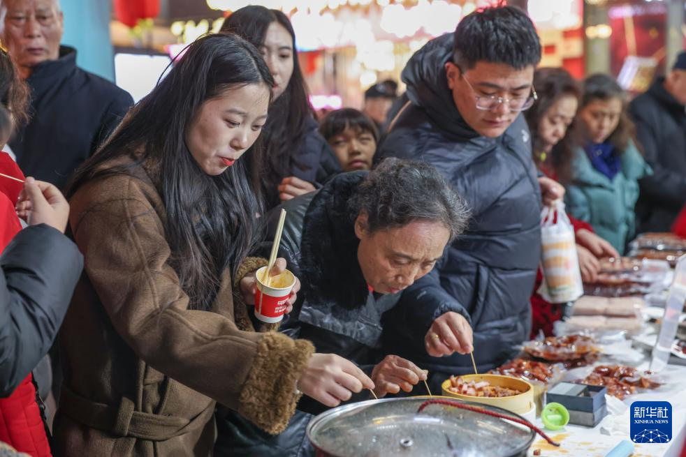 2月1日晚,重庆市两江新区观音桥步行街,市民在现场品尝巴渝“土特产”。新华社记者 陈诚 摄
