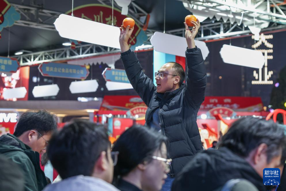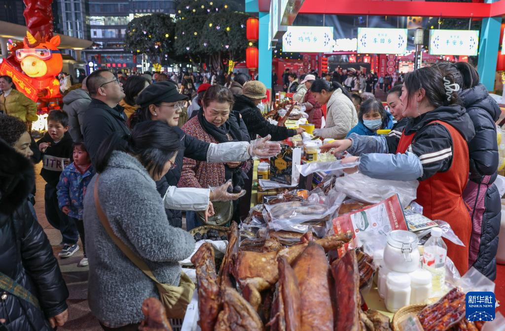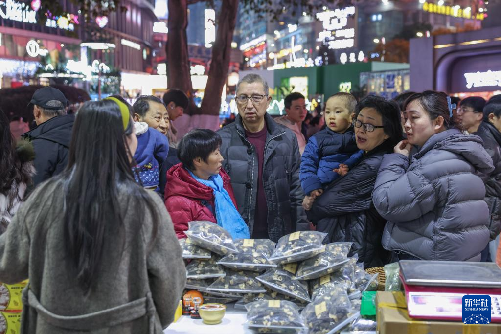 2月1日晚,重庆市两江新区观音桥步行街,市民在现场选购巴渝“土特产”。新华社记者 陈诚 摄