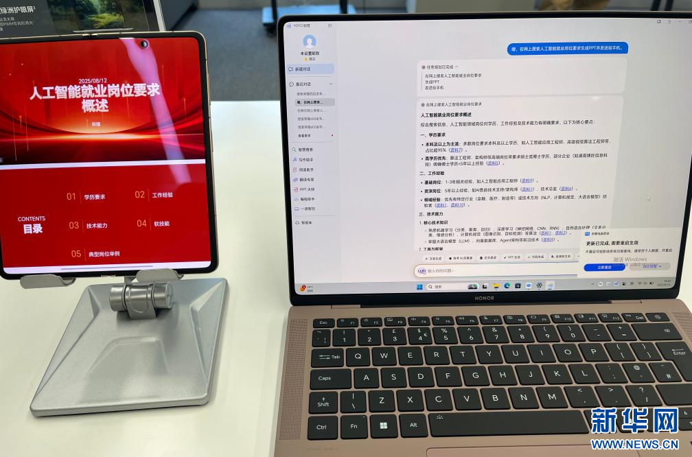 “根据网络搜索的人工智能就业岗位要求,生成PPT并发送至手机。”8月12日,在荣耀公司西安研发中心的展示间,工作人员在笔记本电脑上向AI发出指令几分钟后,一旁的手机就收到了一份完整详尽的PPT。